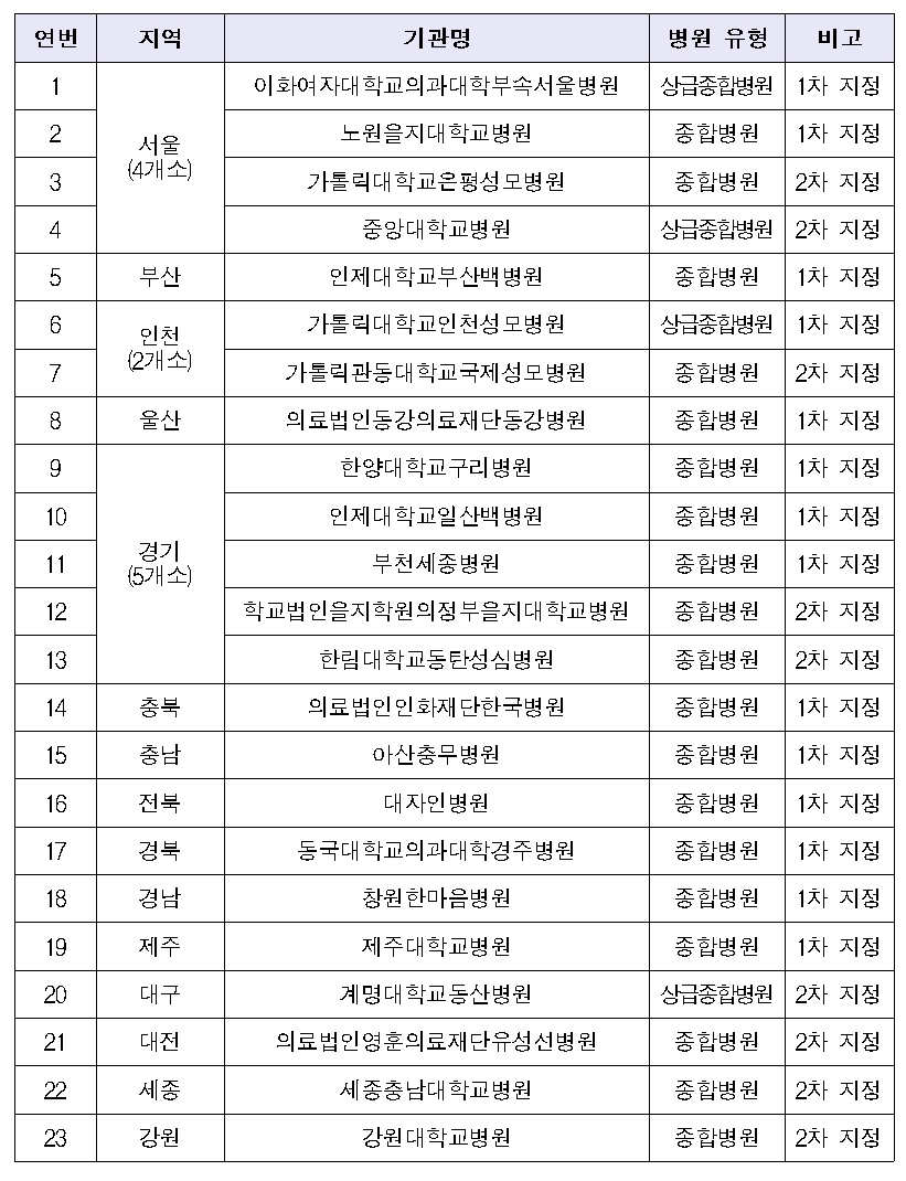 지역별 거점지역응금의료센터 지정 현황은 아래와 같습니다(15개 시도 23개소)
