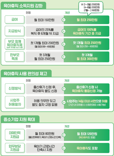 부모 모두 육아휴직 사용: 첫 달 200만 원 → 250만 원