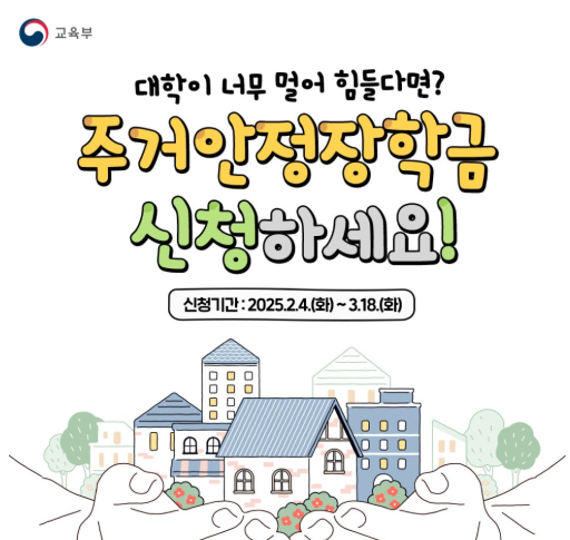 주거안정장학금은 원거리 대학 진학으로 인해 주거비 부담이 큰 기초·차상위 대학생을 대상으로, 주거 관련 비용을 지원하는 국가 장학금 제도입니다. 본 주거지와 진학한 대학 간 거리가 멀어 통학이 어려운 학생들에게 월 최대 20만 원을 지원하여 경제적 부담을 줄여줍니다.