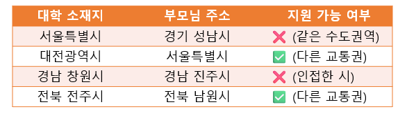 부모의 주민등록상 주소지가 대학이 위치한 지역과 다른 교통권에 있는 경우