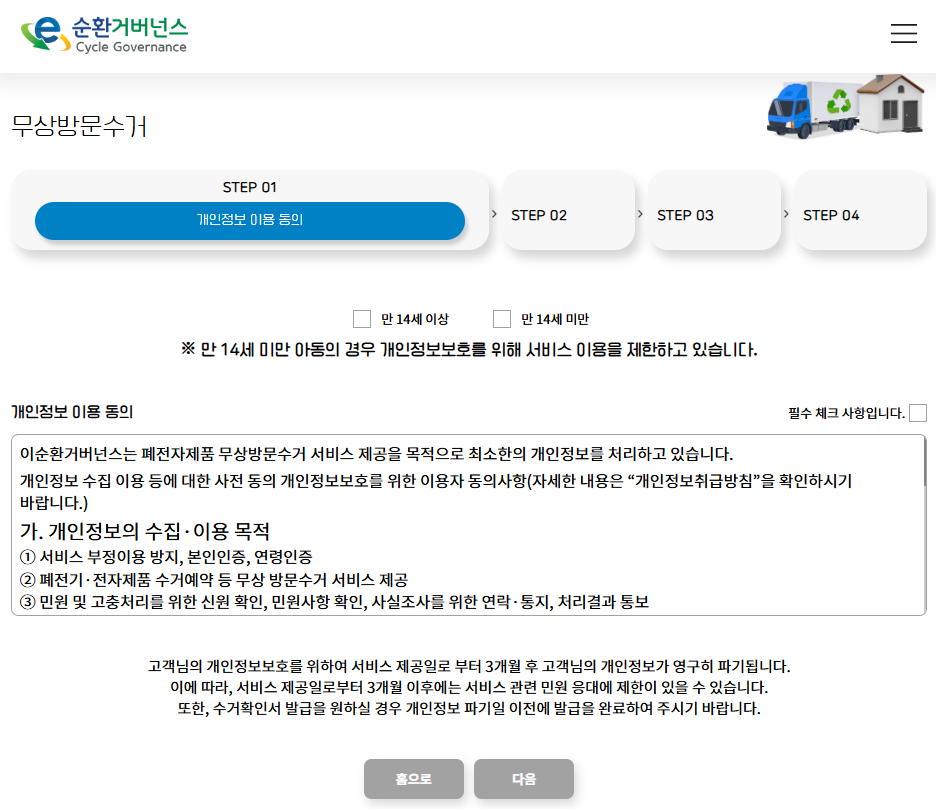 1) 온라인 신청: ‘e-순환거버넌스’ 홈페이지(15990903.or.kr)에 접속하여 회원가입 없이 간단한 절차를 거쳐 신청 가능합니다.