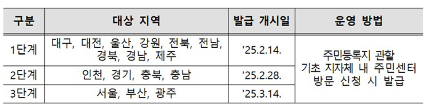 1단계는 대구, 대전, 울산, 강원, 전북, 전남, 경북, 경남, 제주 등 9개 지역에서 발급이 시작됩니다. 이 지역들은 지난해 12월부터 시범운영을 통해 발급 시스템을 시험하고, 개선점을 찾아보았습니다. 따라서, 이번 1단계 발급은 다양한 업무 환경을 고려한 개선 작업과 함께 진행됩니다. 👥