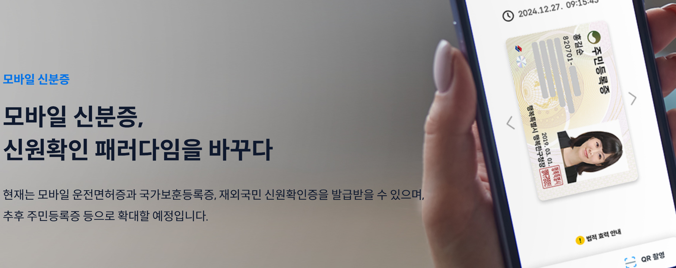 편리성: 스마트폰만 있으면 언제 어디서나 본인 인증이 가능하여, 실물 주민등록증을 따로 소지하지 않아도 됩니다.